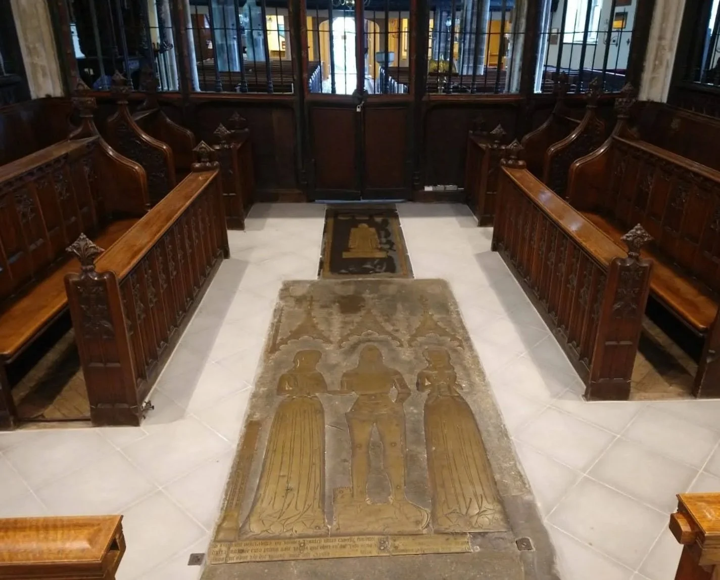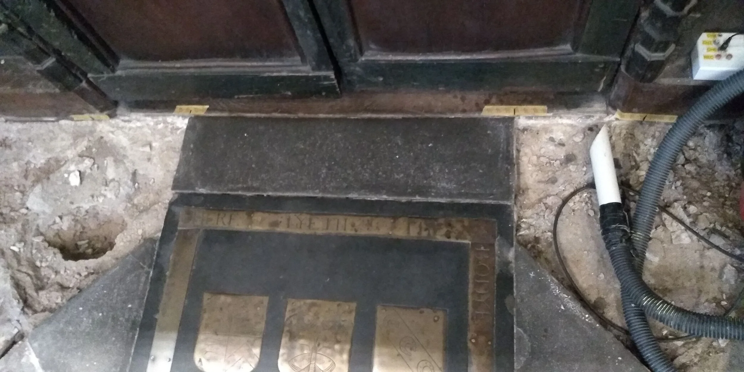 The sandstone floor slabs around this Medieval Knights tomb in St Saviour’s Church, Dartmouth had suffered from a few hundred years of being walked upon. We were asked to carefully remove them, before replacing with new slabs from the same quarry in Hay-on-Wye as the originals. Careful plotting of the original slab locations allowed us to replace the floor around the tomb and choir stalls as closely as possible. All slabs laid on and pointed with lime mortar as per the originals.