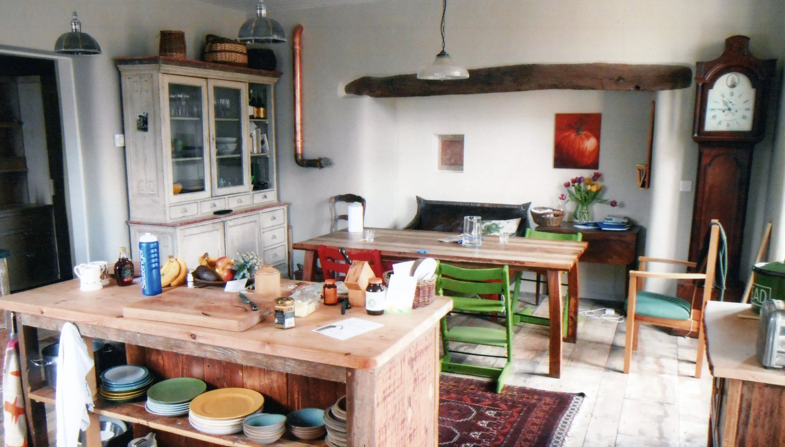 This was a highly detailed brief to extensively renovate a very old building throughout. Floors were raised to create a nine foot high kitchen ceiling, reclaimed beams and organically crafted renders all complimented the original feel of the house. Gothic window openings were created, mezzanine sleeping decks from reclaimed timber and old wooden scaffolding ladders were introduced upstairs. The main kitchen had aged elm flooring, a hand built kitchen from reclaimed timber and a speaking tube from a WW1 American Battleship to allow communication via a copper downpipe to a brass hunting horn on the landing upstairs. Exposed copper pipes, a teak sink and reclaimed brick flooring laid on lime mortar continued the creative feel to the adjacent rooms.